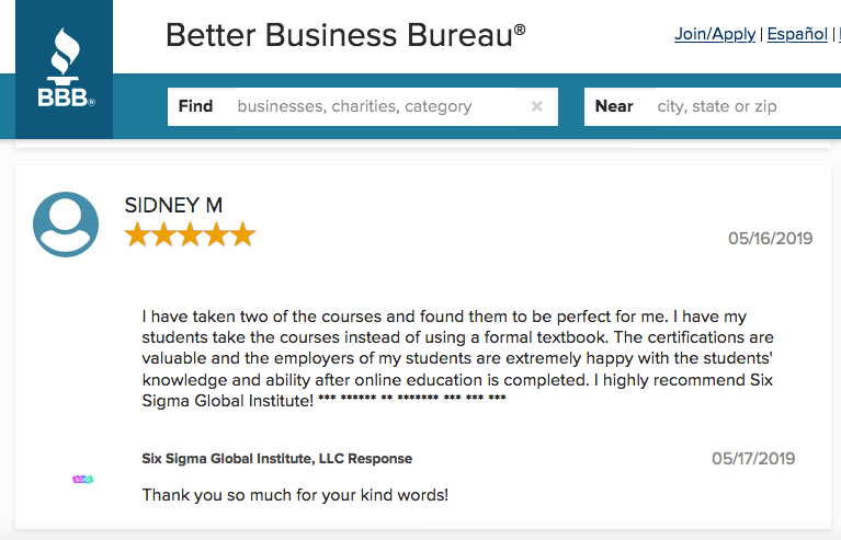 We highly urge potential customers to take the time to do their due-diligence. With that being said, what do those who have taken our programs have to say about Six Sigma Global Institute on Linkedin and Facebook?